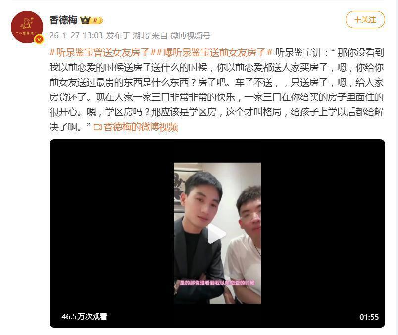 听泉鉴宝在直播中描述得颇为具体:不送车,只送房,连房贷都一手包办。他甚至推测那应该是套学区房,言语间流露出一种 " 深藏功与名 " 的意味—— " 这个才叫格局,给孩子上学以后都给解决了。" 这番说辞,直接将一场关于 " 分手礼物 " 的讨论,拔高到了 " 解决下一代教育问题 " 的层面。