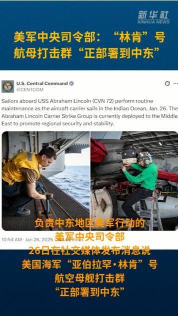 美军中央司令部 26 日在社交媒体上发布图片和文字,显示 " 林肯 " 号航母已进入印度洋。帖文没有明确提及伊朗,该司令部 " 责任范围 " 包括美军在中东地区的军事行动。