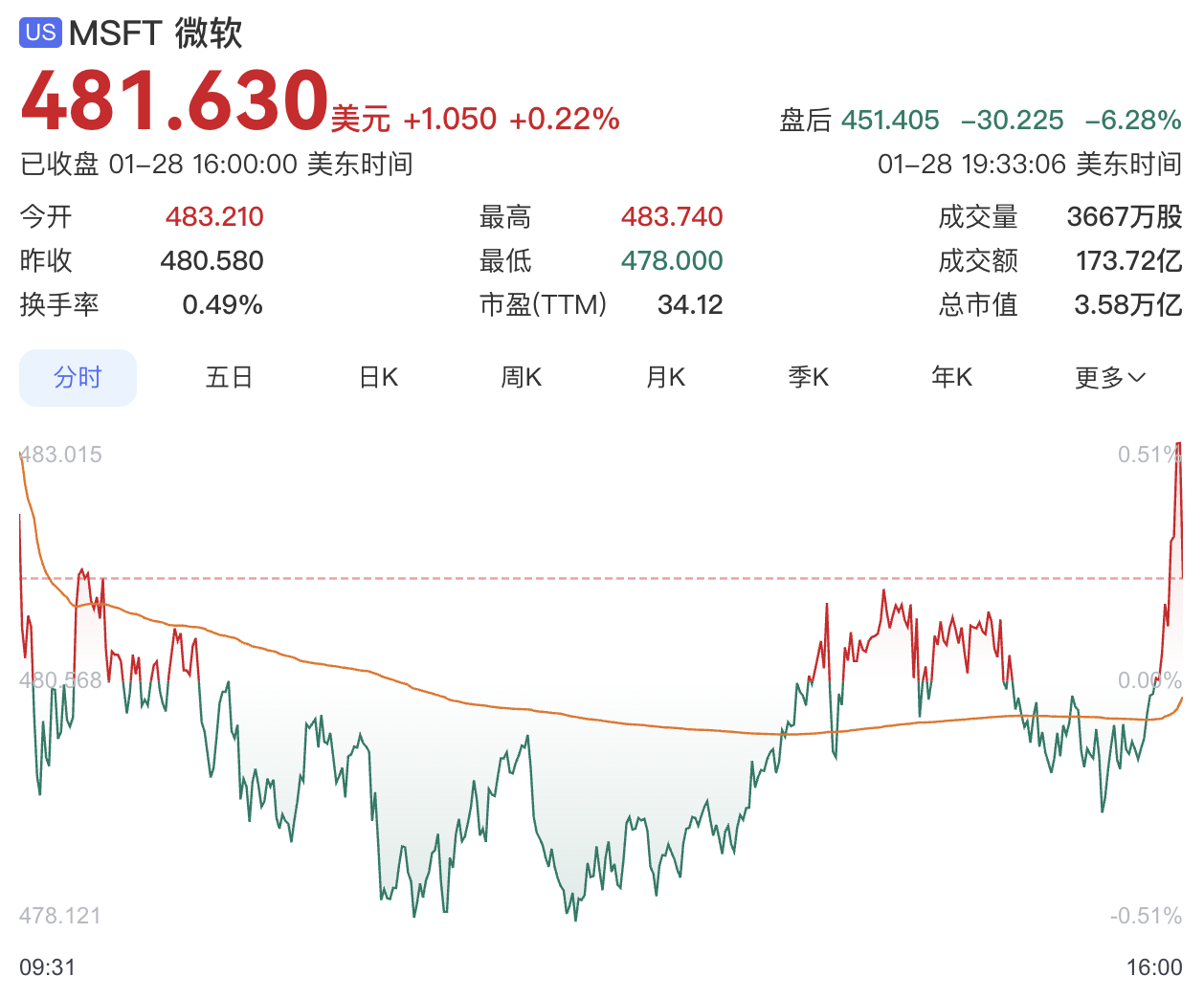 财报发布后,因投资者担心微软对AI的投资需要比预期更长的时间才能获得回报,盘后股价一度大跌8%。截至发稿,仍跌超6%。
