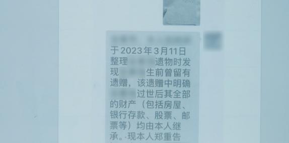 张先生大姐的儿子——外甥李炯在整理遗物时发现了一份张先生生前写下的遗嘱,上面写明,张先生奉贤区的房产、银行存单、股票等由 " 大外孙李烔 " 一人继承。据了解,张先生的遗产涉及到 200 多万元的银行存款、十多支股票和十多万元余额。