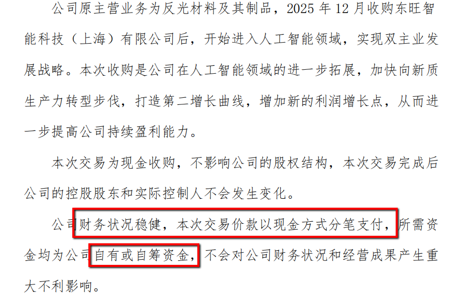2025年12月23日,公司刚以1.4亿元现金收购东旺智能科技(上海)有限公司70%股权,切入人工智能及算力相关领域。时隔仅23天,又抛出收购天宽科技的公告,计划进一步扩大AI业务版图。