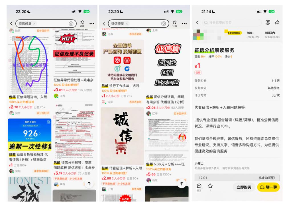 近日,时代周报记者调查发现,有不少人在闲鱼、小红书等平台以 " 免费帮忙看征信 "" 代看征信 "" 征信分析解读服务 " 等为诱饵,开展收费数千元至数万元的 " 征信修复 " 业务。
