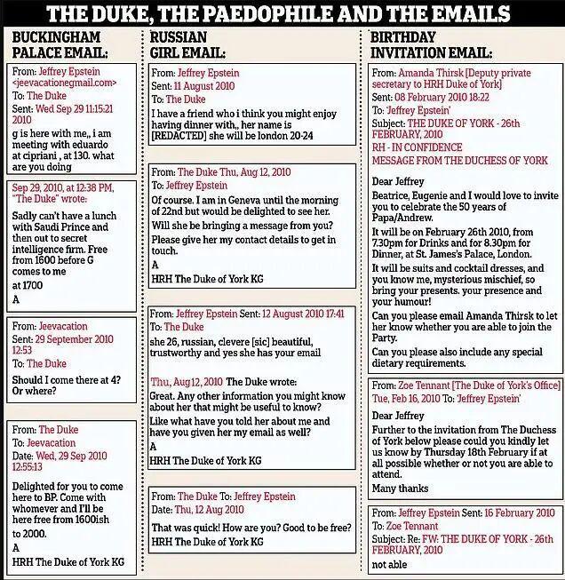 另一封邮件显示,安德鲁王子曾邀请他前往白金汉宫共进晚餐,并表示可以提供 " 充足的隐私 "。目前尚不清楚这次晚宴是否实际举行。