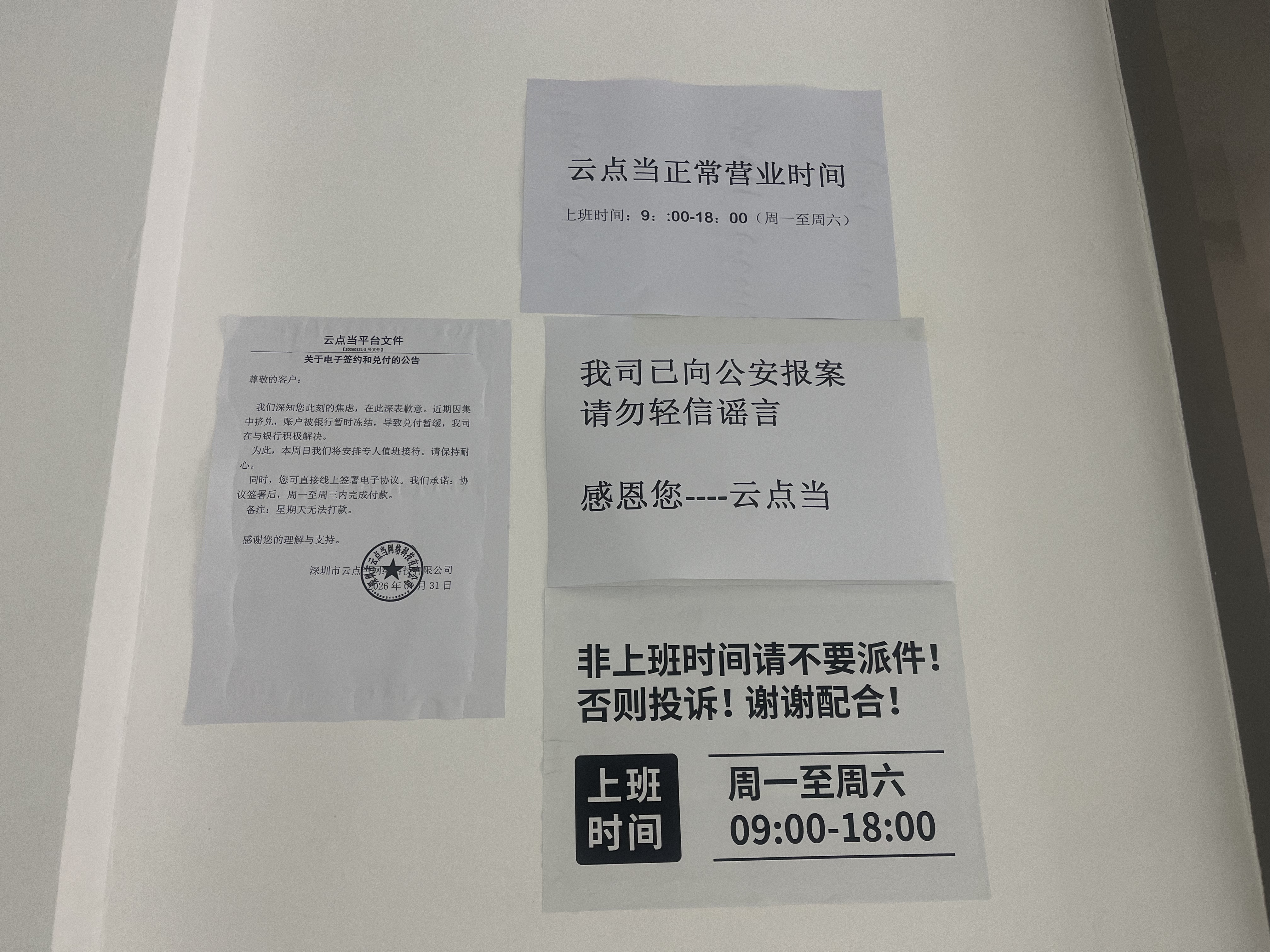 在云点当现场,多张公告贴于墙面,其中包括一份“关于电子签约和兑付的公告”。