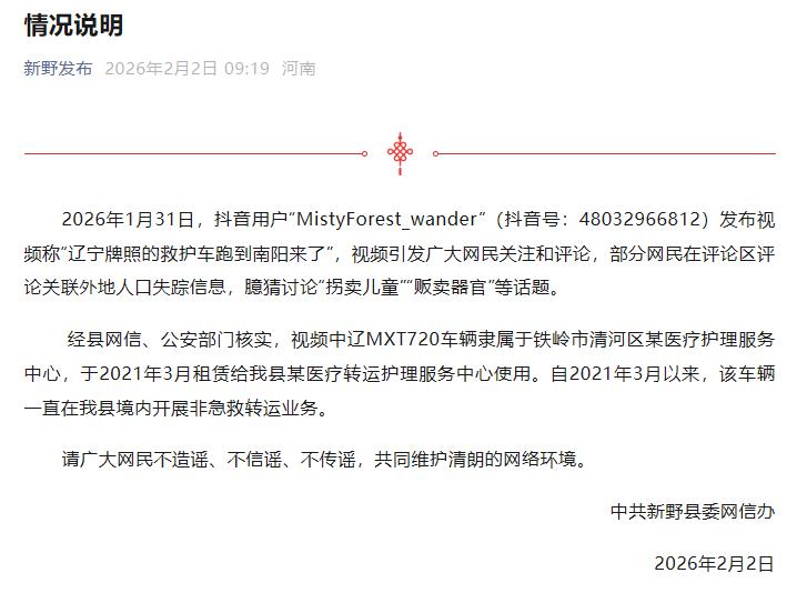2026 年 1 月 31 日,抖音用户 "MistyForest_wander"(抖音号:48032966812)发布视频称 " 辽宁牌照的救护车跑到南阳来了 ",视频引发广大网民关注和评论,部分网民在评论区评论关联外地人口失踪信息,臆猜讨论 " 拐卖儿童 "" 贩卖器官 " 等话题。