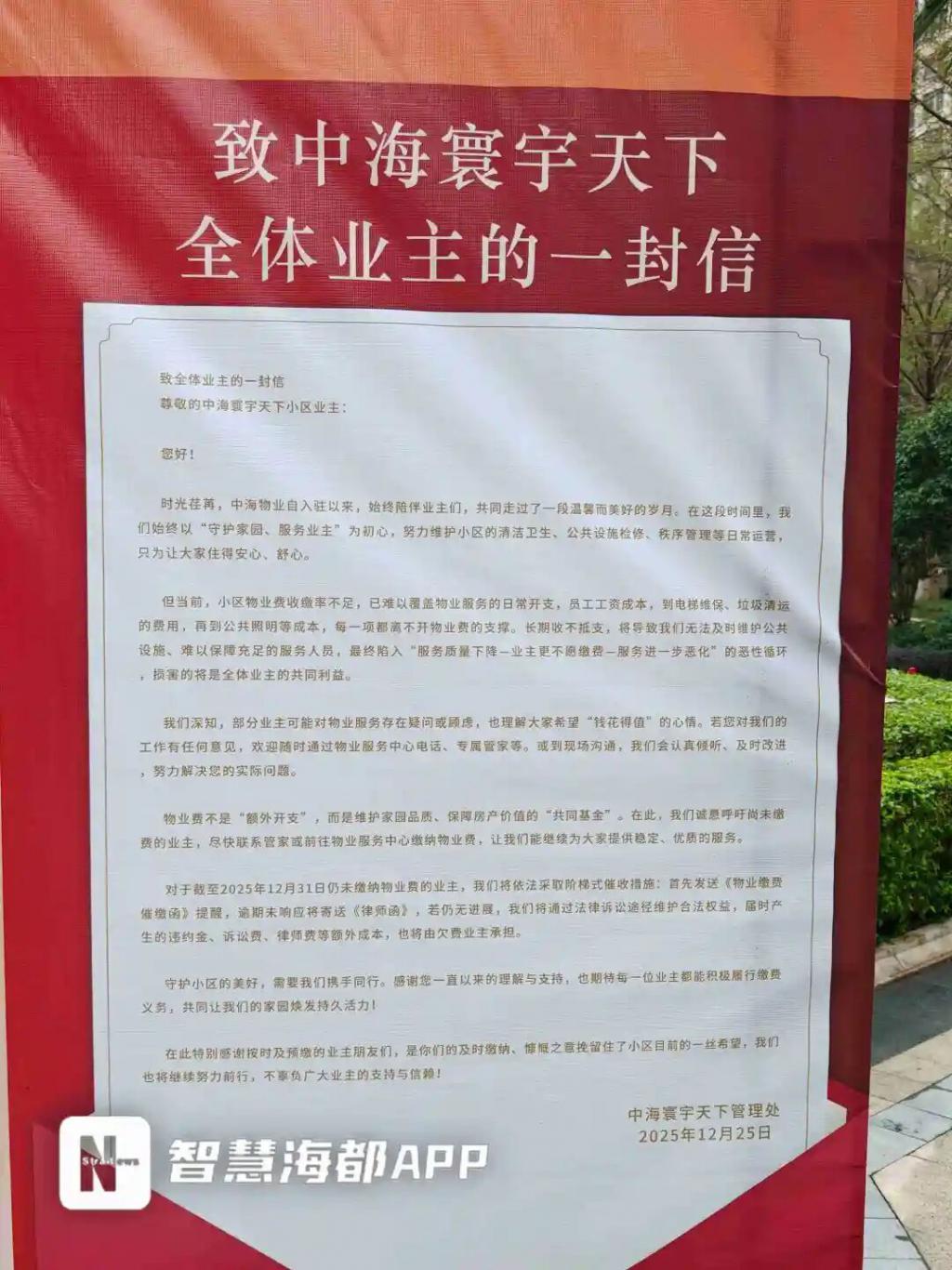 在公示板上,还附有《致中海寰宇天下全体业主的一封信》。信中指出:" 当前,小区物业费收缴率不足,已难以覆盖物业服务的日常开支,从员工工资成本,到电梯维保、垃圾清运的费用,再到公共照明等成本,每一项都离不开物业费的支撑。长期收不抵支,将导致我们无法及时维护公共设施、难以保障充足的服务人员。"