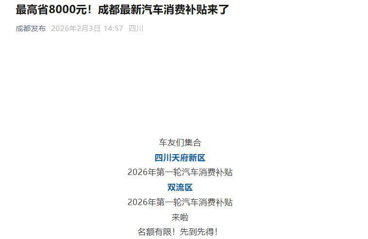 在各地陆续推动汽车以旧换新政策落实的同时,成都市最新汽车消费补贴也上线了。2 月 3 日,据 " 成都发布 " 消息,成都高新区 2026 年第一轮汽车消费补贴活动启动,补贴总预算不超过 3100 万元,其中,新车消费补贴规模 2900 万元,二手车消费补贴规模 200 万元。消费者购置新车或二手车,满足相应条件有机会获得至高 8000 元成都高新区购车补贴,其中,购买二手车最高申请 4000 元购车补贴。