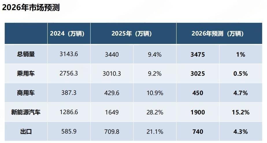 尽管 2026 年汽车 " 两新 " 与新能源汽车车辆购置税政策有所调整,但其对于车市刺激作用仍旧重要。" ‘两新’政策平稳有序衔接,为 2026 年车市稳健增长提供了保障。" 中国汽车工业协会副秘书长陈士华预计,2026 年,中国汽车总销量为 3475 万辆,同比增长 1%。其中,乘用车总销量为 3025 万辆,同比增长 0.5%;新能源汽车总销量为 1900 万辆,同比增长 15.2%。