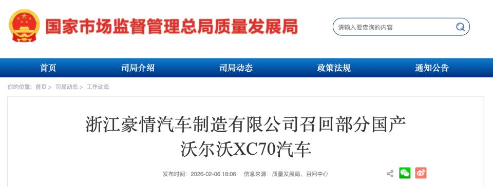 召回编号 S2026M0016V:自即日起,召回 2025 年 5 月 7 日至 2025 年 12 月 22 日期间生产的部分国产四驱 XC70 汽车,共计 14768 辆。