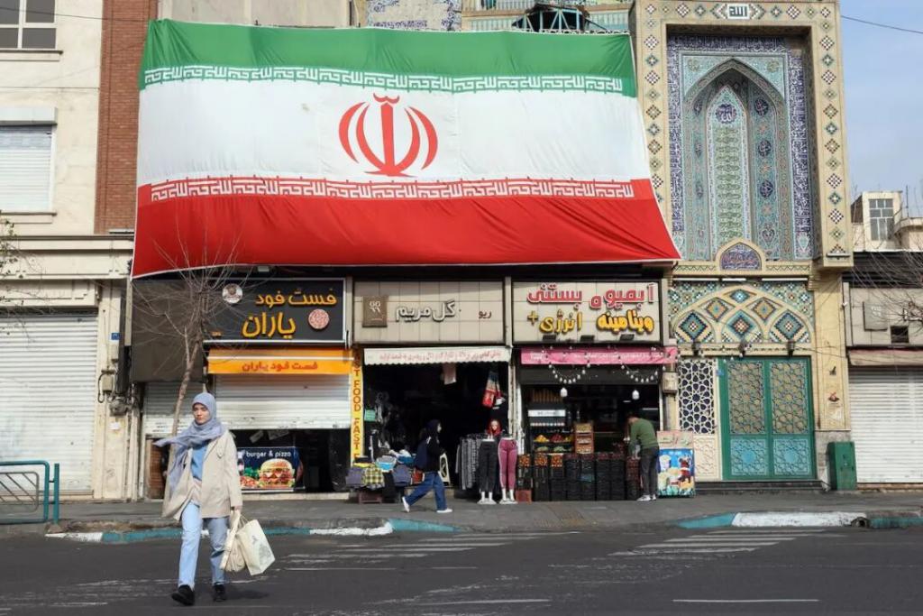 一名伊朗妇女走过悬挂巨幅伊朗国旗的商店。