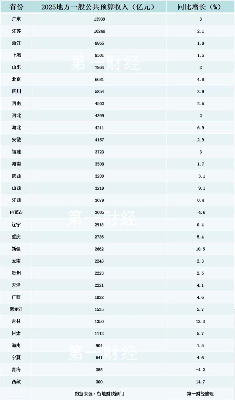 随着地方近期陆续披露当地政府 " 账本 ",2025 年 31 省份地方一般公共预算收入(下称 " 财政收入 ")规模随之揭晓。