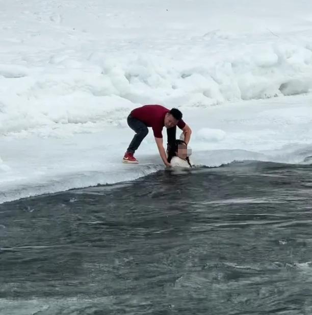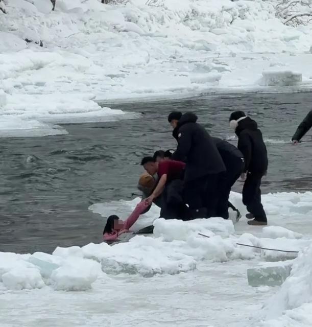 杨云说,当时气温已经到了零下二十摄氏度,水流是冰雪融化而成的,寒冷刺骨。看到女孩能探出水面,他们赶紧呼喊让女孩换气。" 我们指导她仰面躺着,她穿的羽绒服还没有完全湿透,有一定浮力。" 杨云说,他们一开始试图用竹竿去拉女孩,旁边的游客还提供了自拍杆,最后是扔过去一件羽绒服让女孩抓着,成功将她拉了上来。