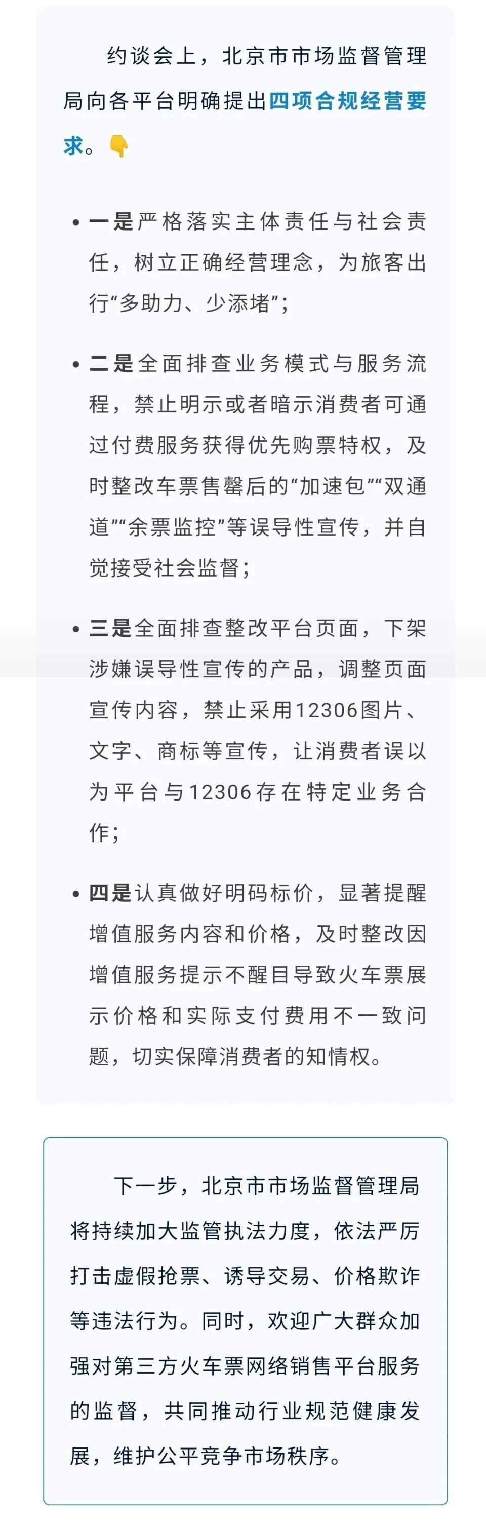首页 > 综合 携程、去哪儿、飞猪、同程、美团等12家第三方火车票网络销售平台被约谈 近日,北京市市场监督管理局组织携程、去哪儿、飞猪、同程、美团、京东、航旅纵横、高铁管家、滴滴、高德地图、百度地图、腾讯地图等 12 家涉及火车票网络销售业务的主流平台,重点围绕群众反映强烈的网络销售火车票突出问题召开行政约谈会。图源:中国铁路来源:北京市场监管