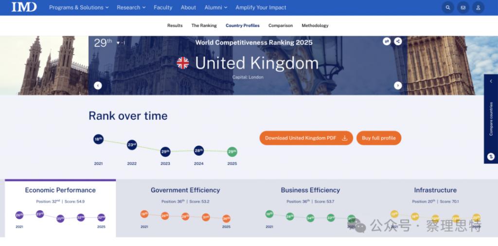 而英国以总分 71.9 分位列全球第 29,其中,经济表现上,英国以 54.9 分位列全球第 32,基础设施建设以 70.1 分位列全球第 20。