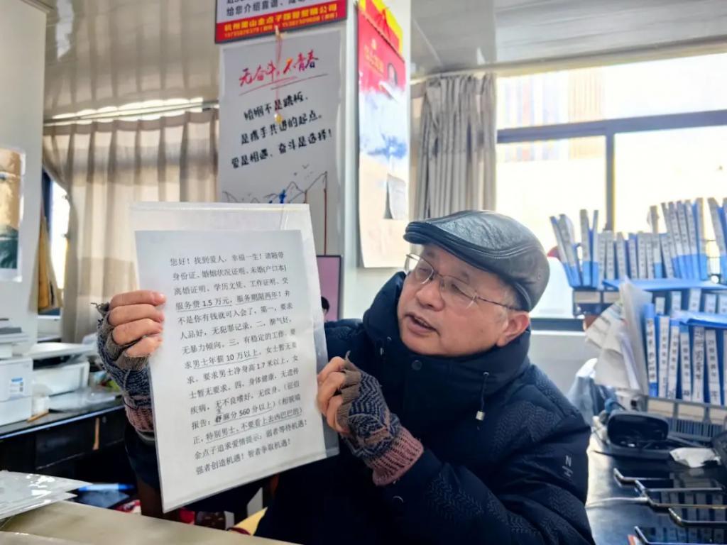 李继延的婚介所门口写着 " 女孩找个倒插门,利国利民又和谐 "/ 祖晓谦 摄