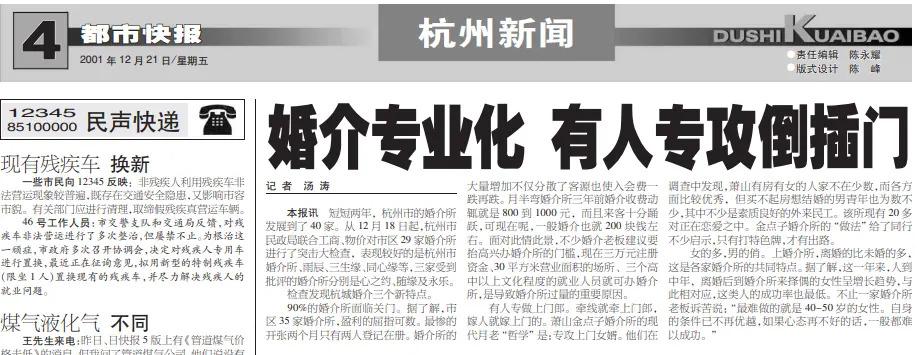 2001 年本地媒体报道李继延的金点子婚介所 " 专攻倒插门 "/ 受访者供图