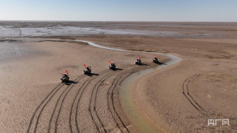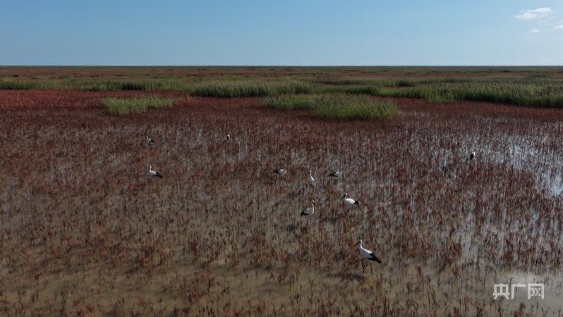 上图为 2023 年 2 月,山东黄河三角洲国家级自然保护区正在进行翅碱蓬机械撒种。下图为 2025 年 8 月,修复后的生态环境吸引了包括东方白鹳在内的多种鸟类前来觅食。(央广网发 杨斌 摄)