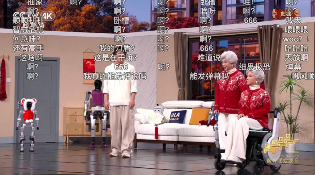 弹幕上的一问一答堪称赛博相声现场,刚有网友提问 " 超哥今年怎么不跳舞了 ",随即就有网友解答调侃:" 因为今年的舞都被机器人跳完了。"