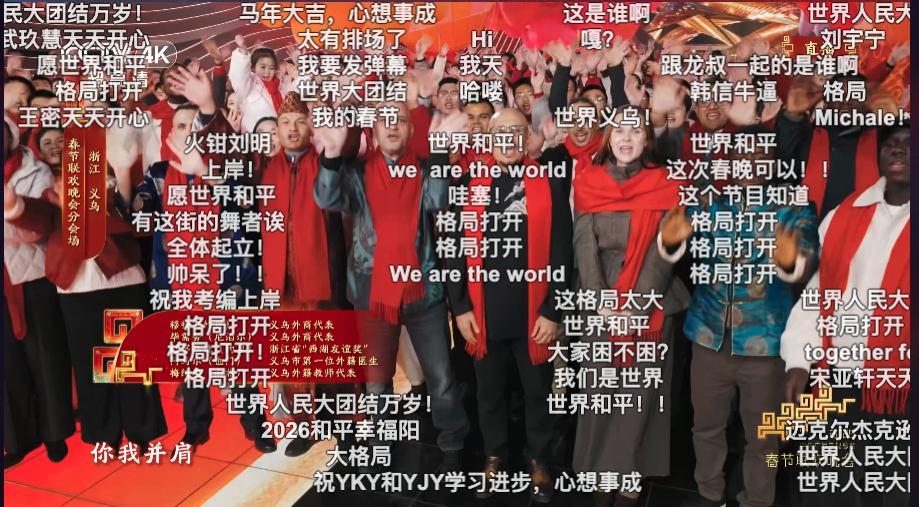 在义乌唱响《We Are The World》本就意义非凡,刷屏的 " 世界和平 " 弹幕更补全了来自普通人的畅想心声。