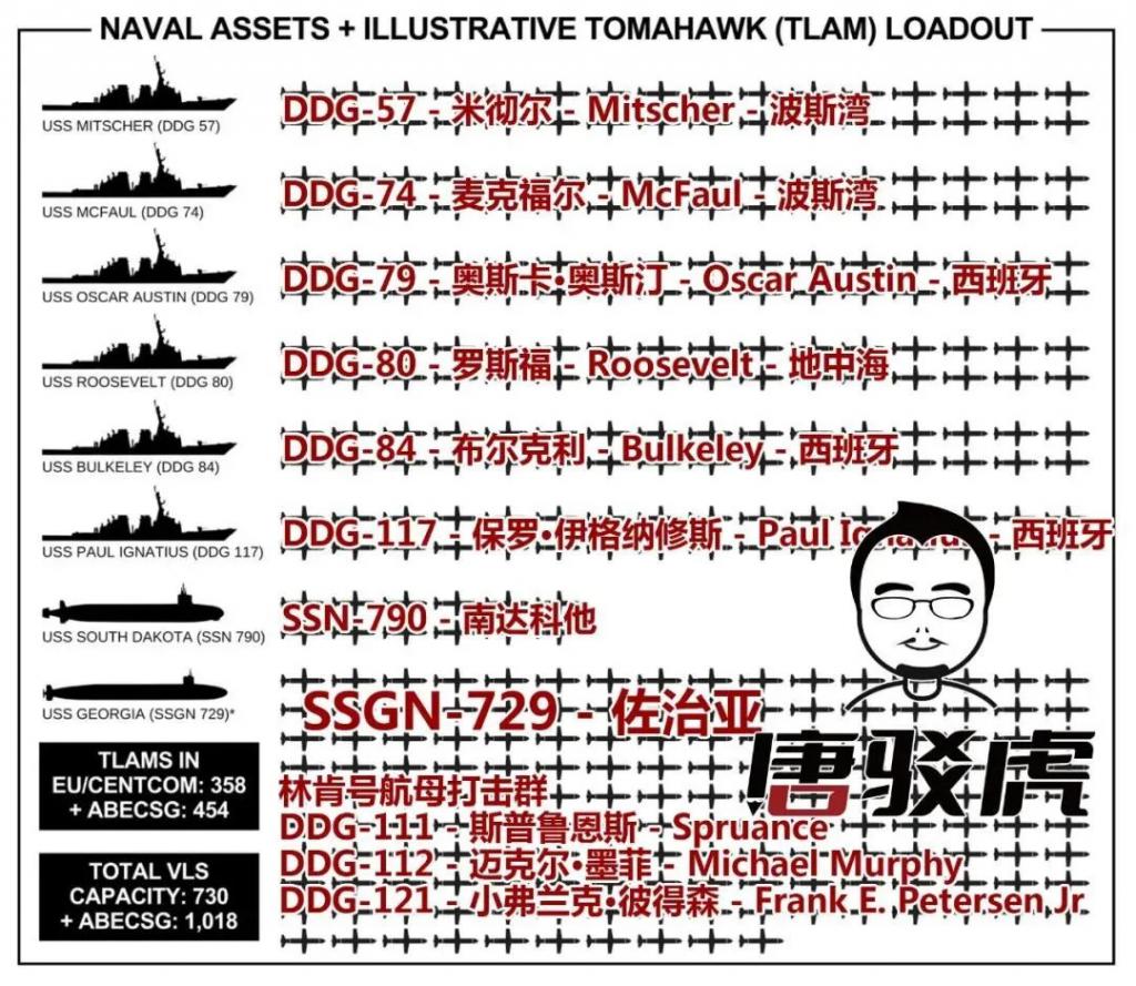 海军方面," 林肯 " 号打击群等拥有 21 艘舰艇、726 个垂发单元,已完成战备的 " 战斧 " 巡航导弹达 500 多枚。