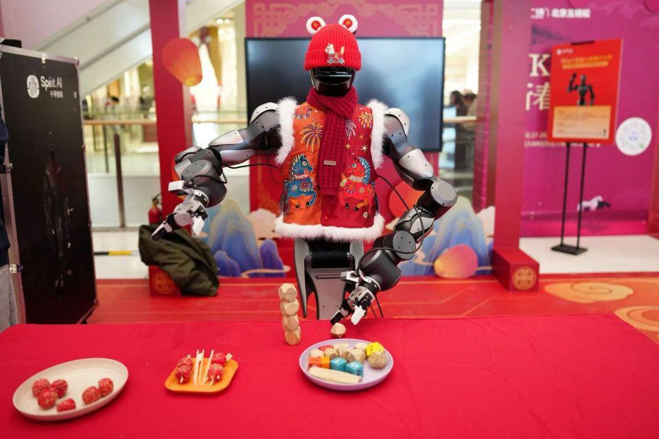 与此同时,机器人的身影已活跃在我们身边:北京一家新开业的智能餐厅里,机器人往来穿梭,有的忙着送餐,有的忙着送祝福;上海一家便利店前,机器人用欢快流畅的街舞表演为开业聚拢人气;浙江金华市科技馆的新春主题活动上,机器人登台演绎传统婺剧;武侯祠成都大庙会上,机器人化身 " 赛博喜神 " 精彩展演;广州白云迎春花市上,机器人穿着大花袄,踩着鼓点扭起秧歌。大年初一登上北京春晚的机器人摇滚乐队 " 灵宝乐队 ",在舞台上实现多机协同、真实演奏,正月也将参加线下演出。