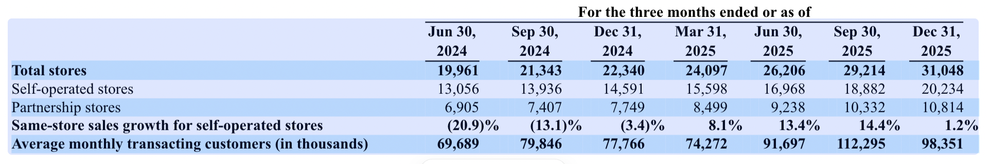 成本高企是利润下滑的重要原因之一。财报显示,四季度其总运营费用达119.55亿元,同比增长38.9%,增速远超营收,主要因业务扩张所致。其中配送费用激增94.5%至16.31亿元,主要源于第三方外卖平台配送量大幅增长;原材料成本与门店租金等运营成本也分别同比增长33.2%和32.8%,均与门店数量扩张、产品销量提升直接相关。