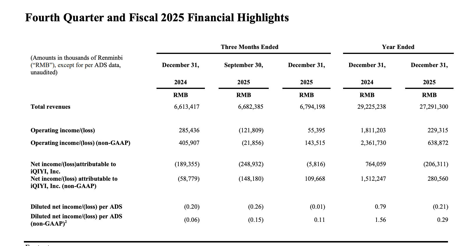 2月26日美股盘前,爱奇艺(IQ.NASDAQ)披露2025年第四季度及全年未经审计的财务业绩,报告显示,2025年全年爱奇艺总收入为272.9亿元人民币,较2024年同比下降7%,结束了此前的增长态势;2025年全年基于非美国通用会计准则(Non-GAAP)运营利润为6.4亿元,较2024年的23.6亿元下滑约73%。财报发布后,爱奇艺美股股价震荡走低,截止收盘,公司股价下跌3.39%报1.71美元,总市值16.47亿美元。