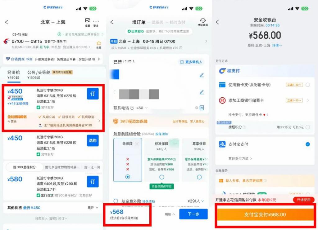 记者在携程旅行购票,各个步骤及价格展示。