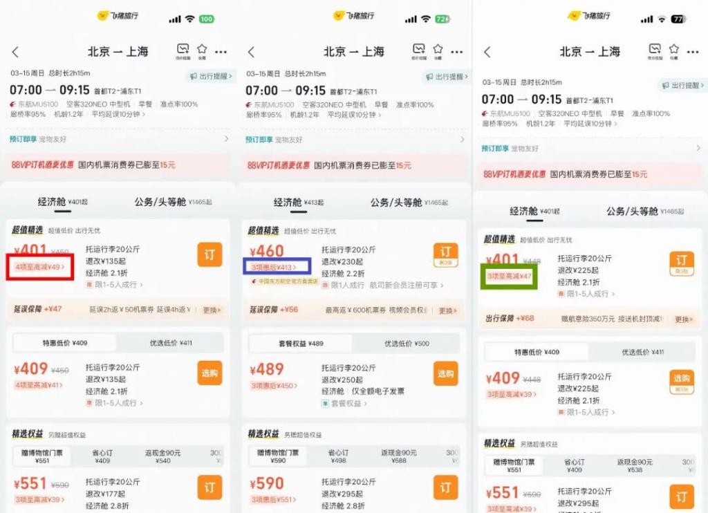 记者 3 月 11 日(左图红框)、3 月 12 日(中间蓝框)、3 月 14 日(右图绿色)搜索机票时的价格描述不停发生变化。