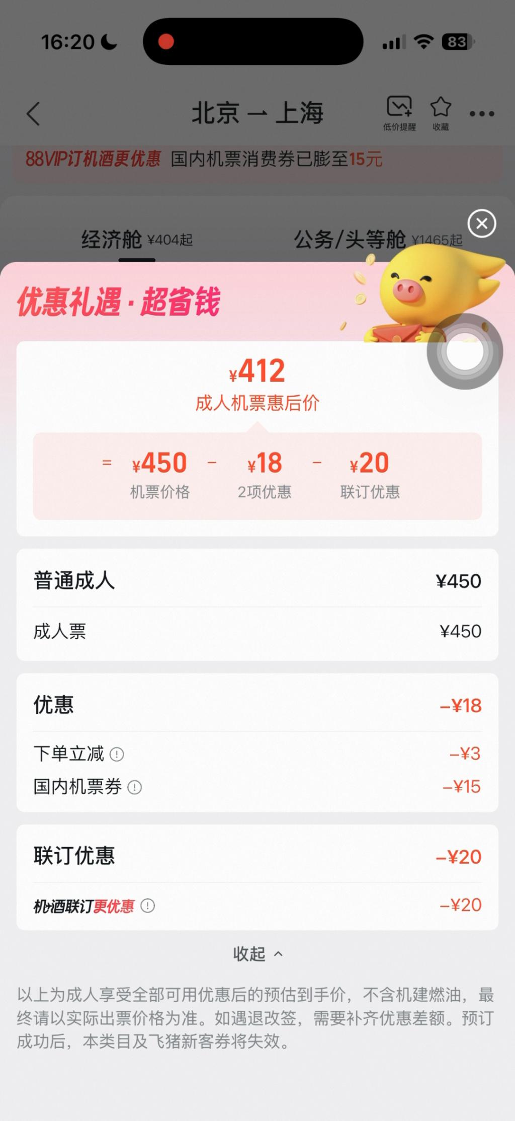 但在这几个计算步骤里,看似都和最初显示的 404 元没有关系。记者计算发现,404 元的得出是由 450 元基础票价和 "4 项最至高减 46 元 " 的所谓 " 优惠 " 相减构成,即上述 26 元的优惠加上 20 元的机酒连订优惠。