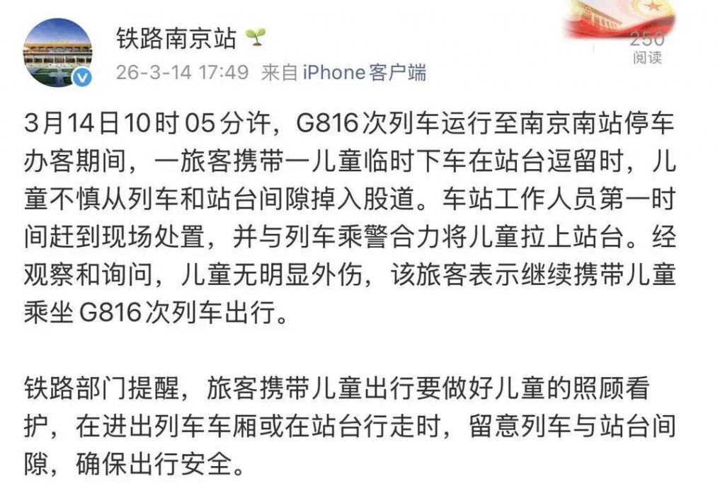 17:49,铁路南京站发布情况情报:3 月 14 日 10 时 05 分许,G816 次列车运行至南京南站停车办客期间,一旅客携带一儿童临时下车在站台逗留时,儿童不慎从列车和站台间隙掉入股道。车站工作人员第一时间赶到现场处置,并与列车乘警合力将儿童拉上站台。经观察和询问,儿童无明显外伤,该旅客表示继续携带儿童乘坐 G816 次列车出行。