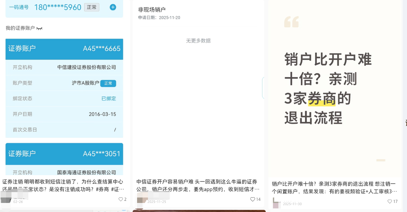这种‘宽进严出’的所带来的落差,引来众多投资者选择在各大社区平台上宣泄。界面新闻记者在浏览抖音、小红书等社交平台后发现,因销户体验不佳而随之发帖的吐槽并不鲜见,一篇销户难的帖子下跟帖的同家券商相似销户经历者更不在少数。