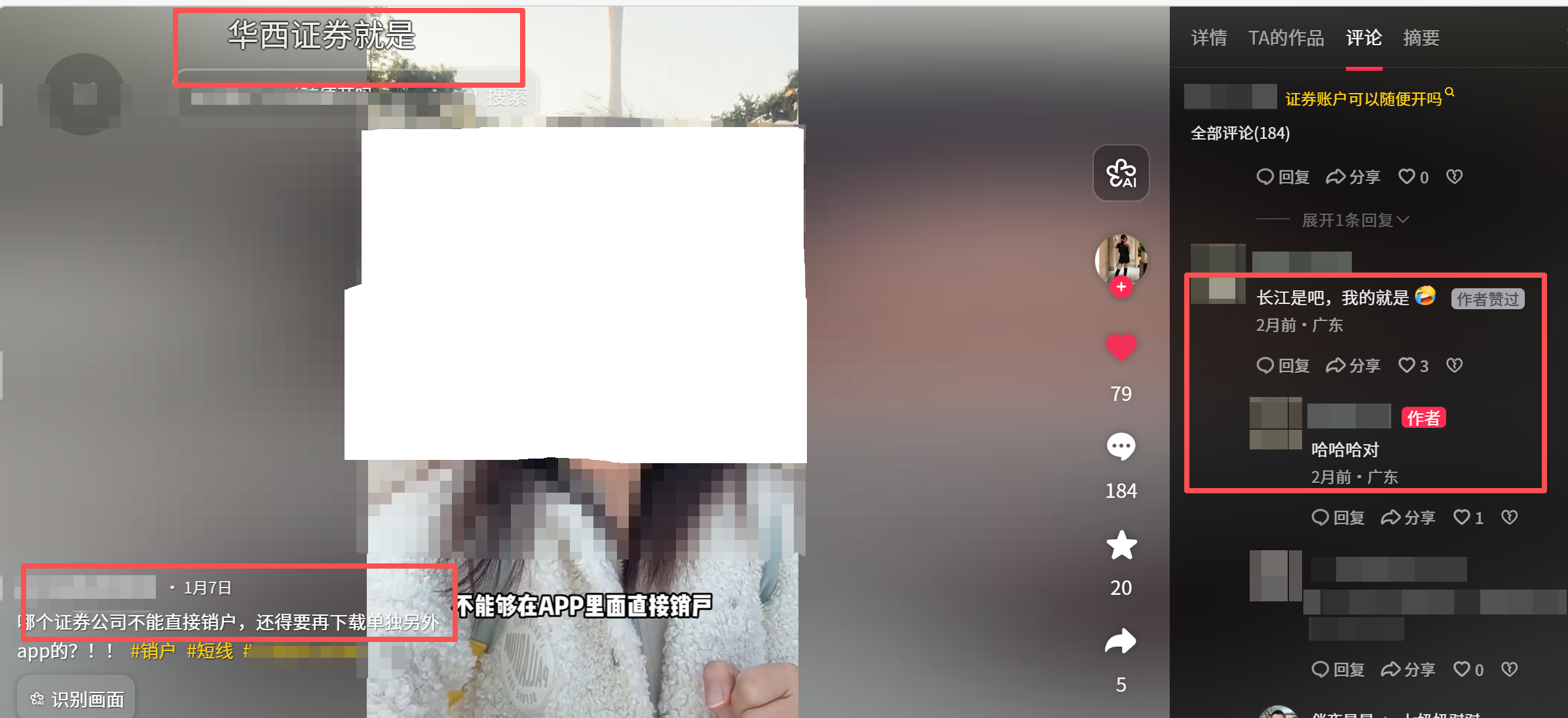 例如,华西证券和长江证券均被不少投资者反映销户需要单独下载专门的销户APP;华宝证券在销户环节存在视频确认排队等待时间久的问题;中信证券销户完结后,客户经理还会继续追着加微信来推销。