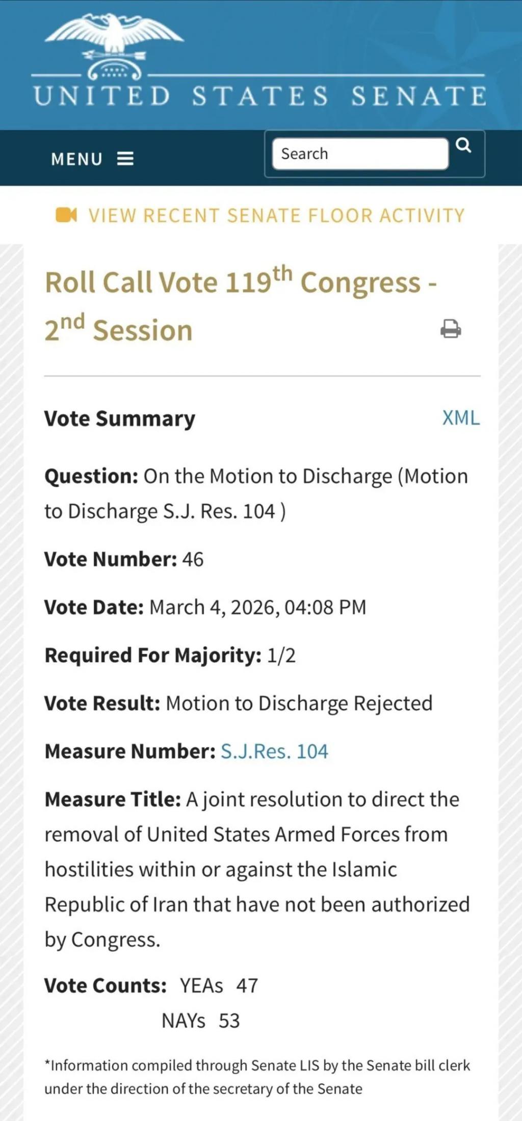 美国国会参议院“限制总统对伊朗动武”的议案未通过,47 票赞成、53 票反对