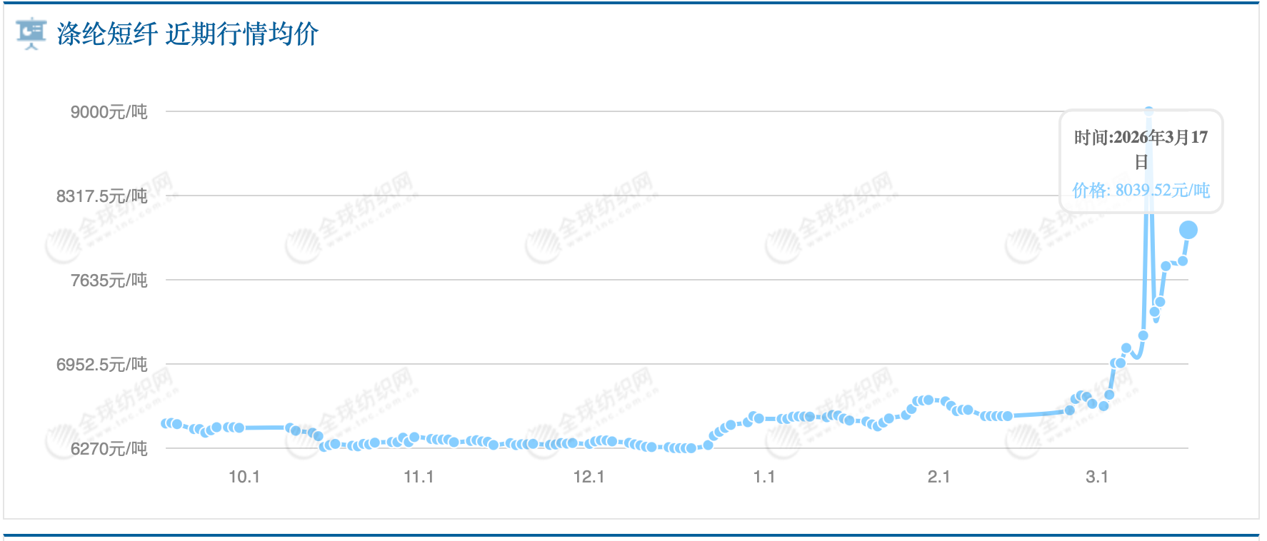 以涤纶纤维中一种主要产品类别“涤纶POY”的行情为例,据全球纺织网数据,该产品报价从今年1月底开始逐渐走高,突破7000元/吨;进入3月后急剧上涨,到3月10日一度达到9600元/吨。截至3月17日,其报价仍保持在高位,为9325元/吨。