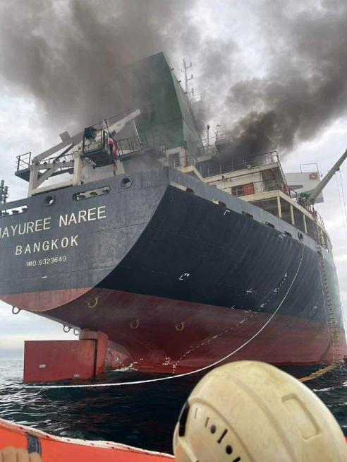 这张泰国海军 3 月 11 日发布的照片显示,一艘泰国货船在霍尔木兹海峡海域遭袭起火。图源:新华社