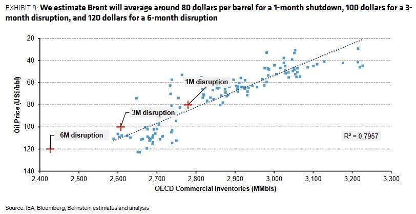 伯恩斯坦能源团队围绕封锁时长构建了三种情景模型:若封锁维持一个月,布伦特峰值约 100 美元 / 桶;若延续至三个月,峰值攀升至 140 美元;若长达六个月,峰值可能触及 170 美元 / 桶。伯恩斯坦将一个月封锁视为基准情景,但同时明确指出,三至六个月的封锁情景下,全球经济衰退将 " 不可避免 "。