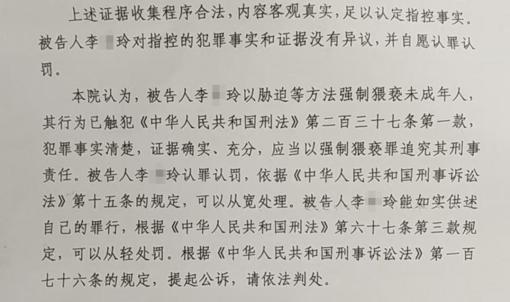 一审判决书显示,公诉机关认为,被告人李某玲以胁迫等方式强制猥亵未成年人,应当以强制猥亵罪追究其刑事责任。同时,李某玲能如实供述自己的罪行,可以从轻处罚;认罪认罚,可以从宽处理。