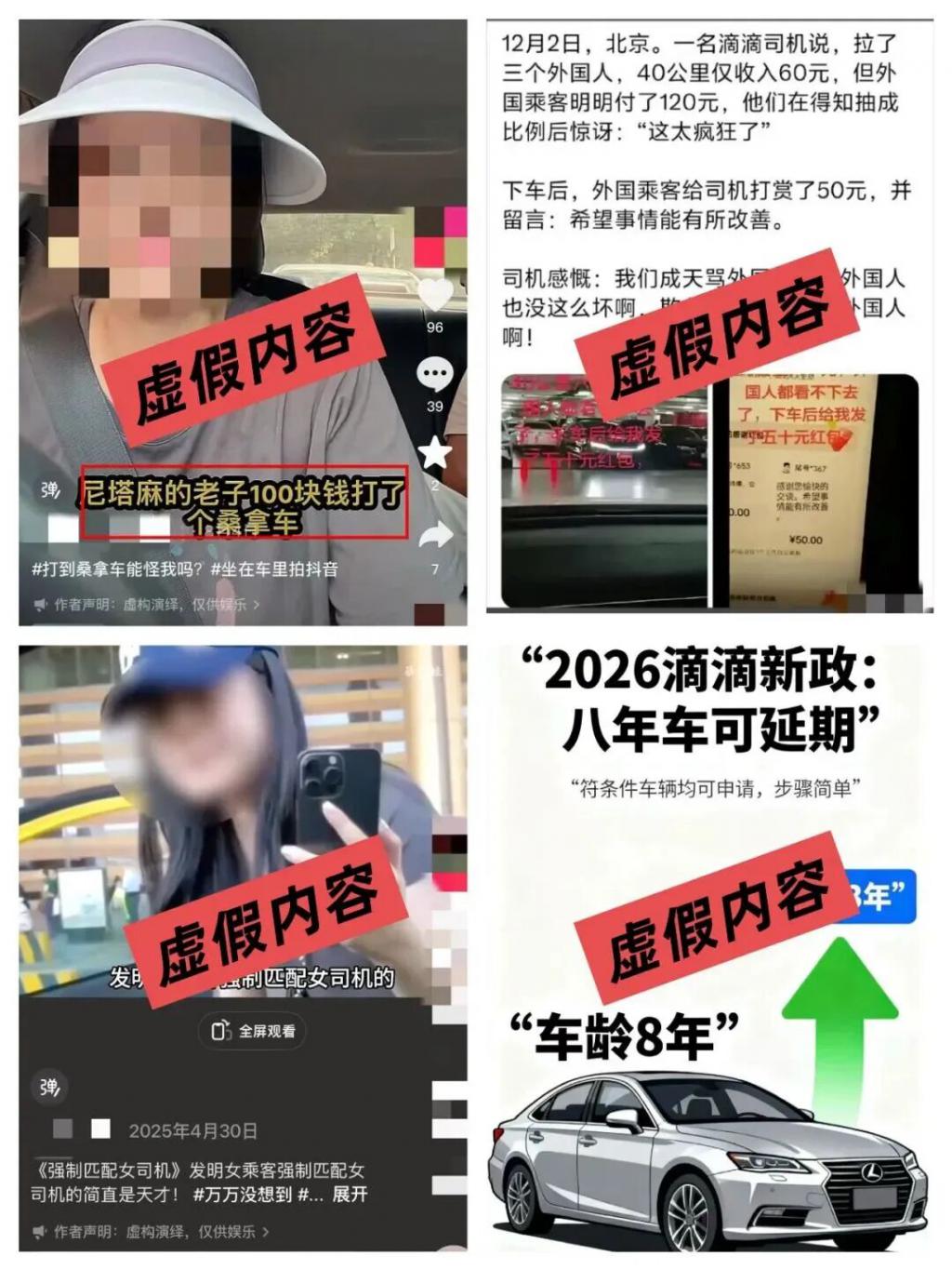 近期网络上有关网约车行业的虚假演绎、恶意摆拍视频时有出现,比如 "100 元打个桑拿车司机到手 49 元 "" 司机 40 公里赚 60 元外国人打赏 50 元 ""8 年超龄车延期 3 年营运 " 等,目的是 " 吸引关注 "" 博流量 ",相关行为挑拨司乘矛盾、污名化司乘群体外界形象,严重误导舆论,干扰网约车行业正常生态,还可能涉嫌违法。