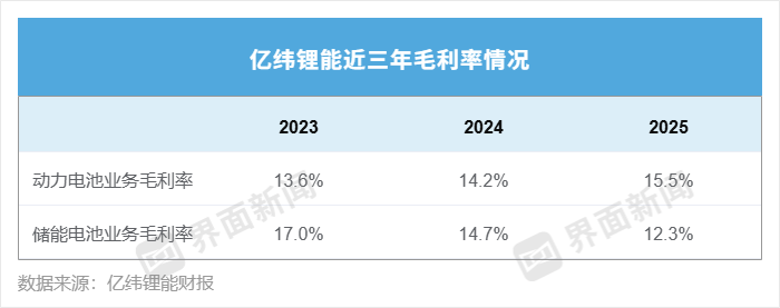 分业务看,2023-2025年,亿纬锂能动力电池业务板块的毛利率逐年增长。