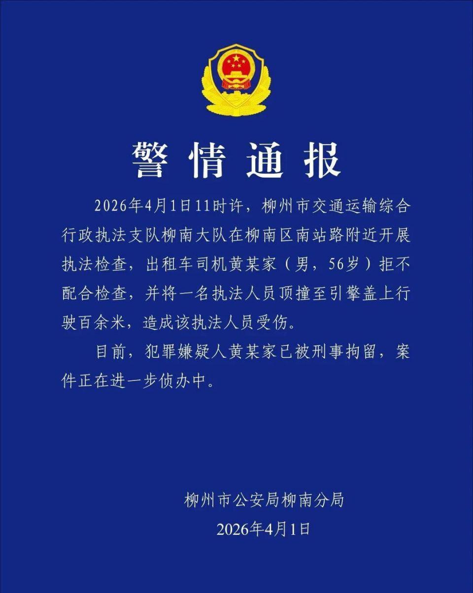 2026 年 4 月 1 日 11 时许,柳州市交通运输综合行政执法支队柳南大队在柳南区南站路附近开展执法检查,出租车司机黄某家(男,56 岁)拒不配合检查,并将一名执法人员顶撞至引擎盖上行驶百余米,造成该执法人员受伤。目前,犯罪嫌疑人黄某家已被刑事拘留,案件正在进一步侦办中。
