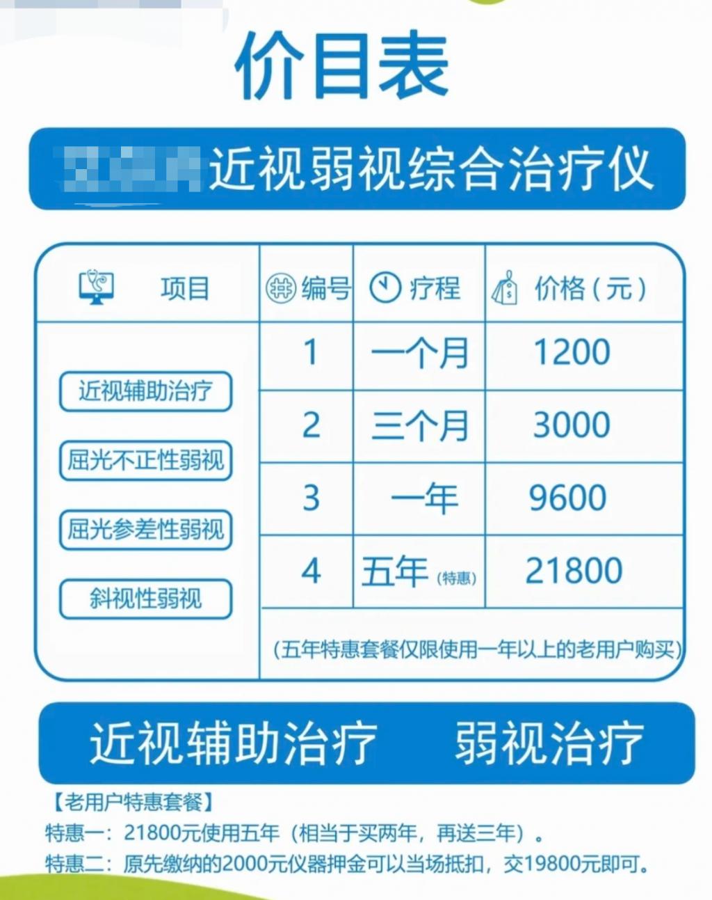 在孩子双眼视力 1.0、眼底正常的情况下,诱导家长签下五年租赁合同,支付 2.18 万元租金,但未告知任何使用风险。