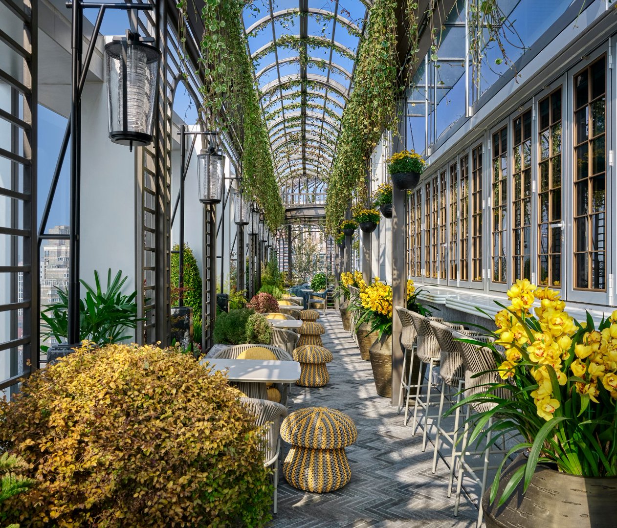 位于顶层的THE ROOFTOP BAR则致敬上海前卫格调与创意活力,酒吧墙面特别陈列了时装设计过程中的装裱艺术。特别的是,打开露台的窗户,调酒师可以直接和客人互动调酒。