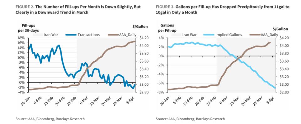 每次加油量的变化则更为触目。每笔交易隐含的加油量从历史上高度稳定的约 11 加仑降至约 10 加仑,同比下降 7%。巴克莱指出,这在历史数据中属于极不寻常的变化,是消费者对高油价最直接的行为反应——在出行需求相对刚性的情况下,选择每次少加油以控制单次支出。