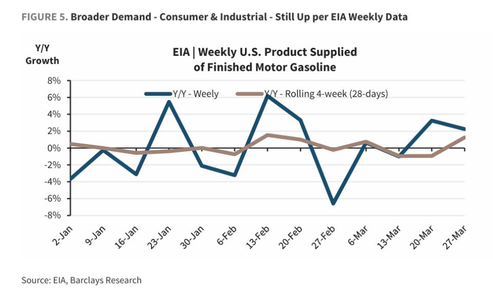 由于信用卡交易数据仅记录交易金额而非实际加仑数,巴克莱通过总支出与 AAA 平均零售油价推算消费量。为剔除季节性因素——尤其是从冬季向夏季驾驶旺季过渡期间的波动——分析采用同比口径。