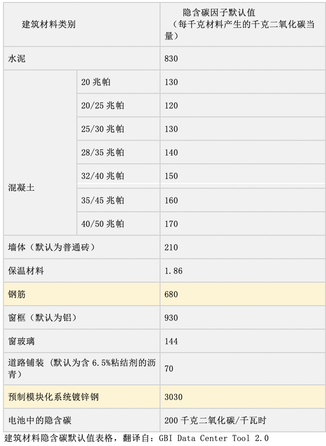 表格中包括了不同建筑材料的碳排放基准,单位为每千克材料产生的千克二氧化碳当量:其中钢筋(Reinforcement Steel Bar)的默认值为680,预制模块化系统镀锌钢(Prefabricated Modular System Galvanised Steel)的默认值则为3030。