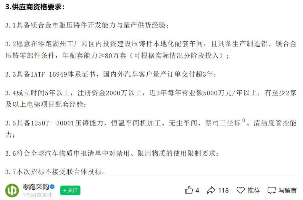 新势力与传统车企也未缺席这场变革。就在 2026 年 3 月初,零跑汽车在其采购公众号上公开发布了寻找镁合金电驱压铸件供应商的需求。几乎在同一时间,长安汽车也发布了一体化镁合金后地板样件项目的招标公告。