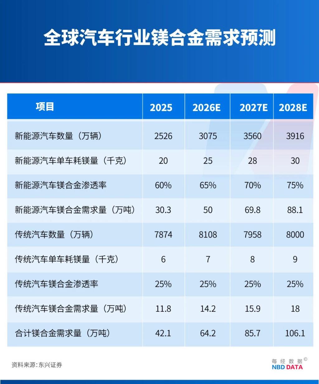 东兴证券在其研报中预测,全球汽车行业镁合金需求将从 2025 年的 42.1 万吨增长至 2028 年的 106.1 万吨,年均复合增长率高达 36%。