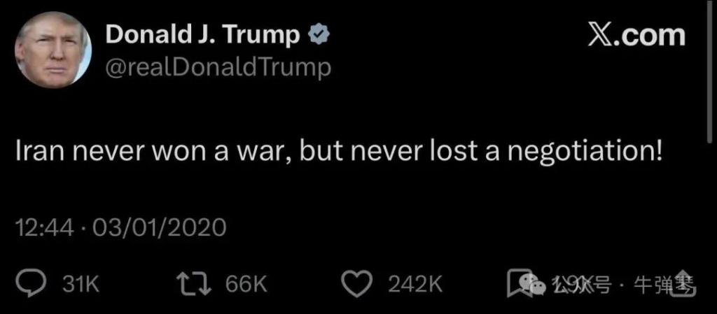 我看到,有网友翻出了 2020 年他的一条推文,上面写道:伊朗从来没赢得过一场战争,但从来没输掉过一场谈判!