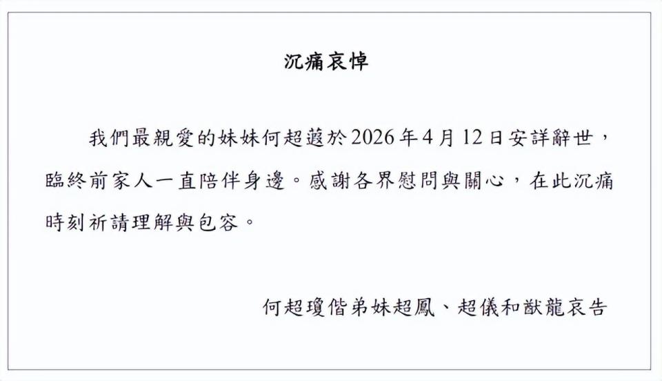 何家发布讣告,交代最亲爱的妹妹何超蕸于 2026 年 4 月 12 日安详辞世,临终前家人一直陪伴身边,感谢各位慰问与关心,在此沉痛时刻祈请理解和包容。